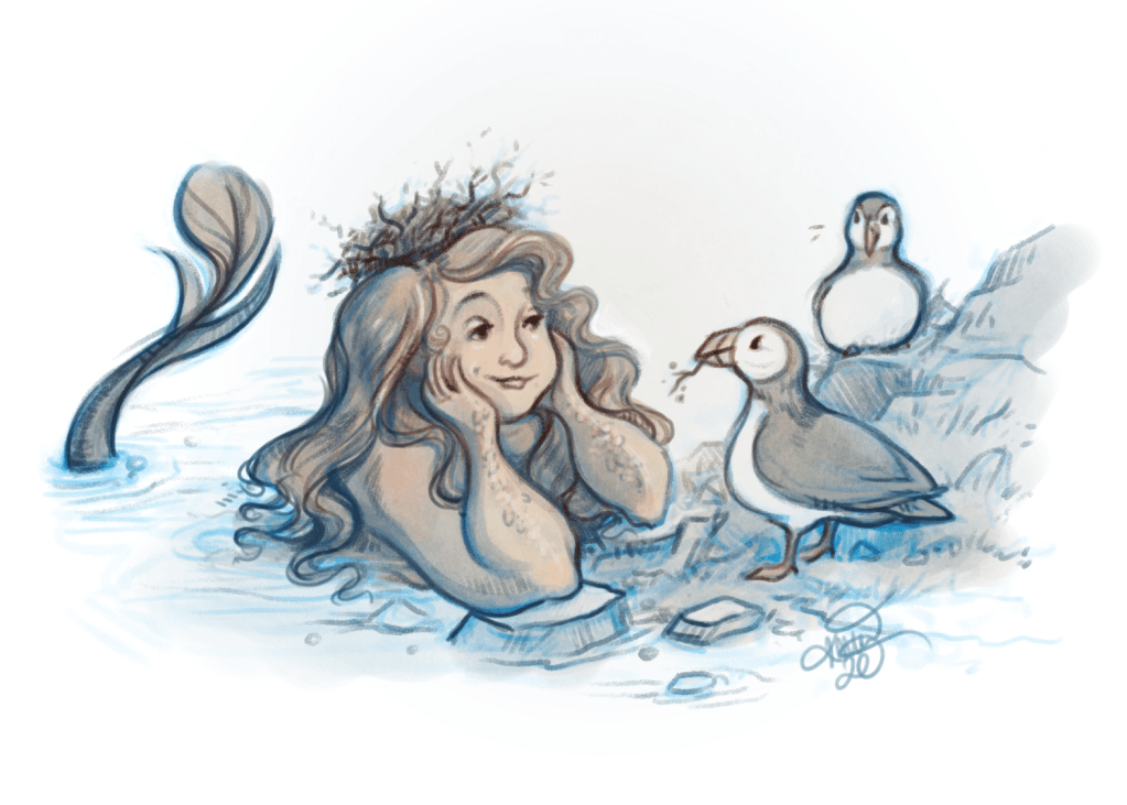 So now when she asks about concerns, the puffins have none, and instead bestow upon their queen gifts—of strong sticks and colorful coral—for they will be forever grateful for all she has done.