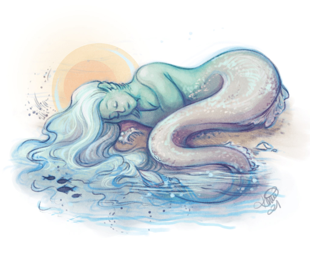 The beautiful princess wakes by the sea. Her long tresses trail behind her, winding into the sand and the sea foam. As the sun rises, she begins to take her pearl comb through her hair—slowly through the knots, the tangles, releasing the debris into the sea. Creatures of water and sand dart about all day as she works, sustaining themselves from the stray flora and fauna she discards. When the sun begins to set, the princess finally reaches the ends of her hair, her aquatic subjects full and happy. She smiles at her place in this small ecosystem, lays her head to rest on the loamy sand, and sleep until morning, when the ritual will begin again.