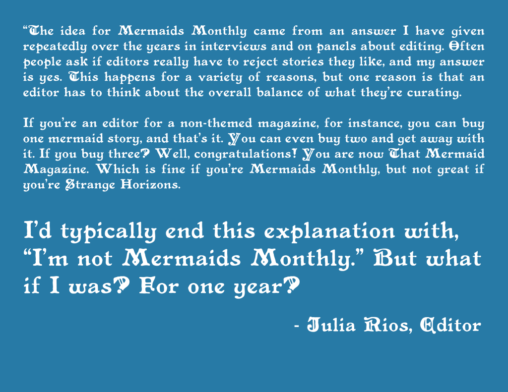 The second submission period for Mermaids Monthly has closed! We will not be reading more submissions for the magazine in 2021.